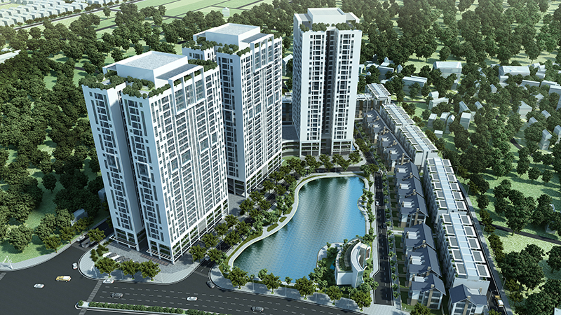 - Quy mô dự án: Bao gồm 03 tòa chung cư cao 25 tầng, 83 căn biệt thự và liên kế, công trình công cộng dịch vụ cao 2 tầng